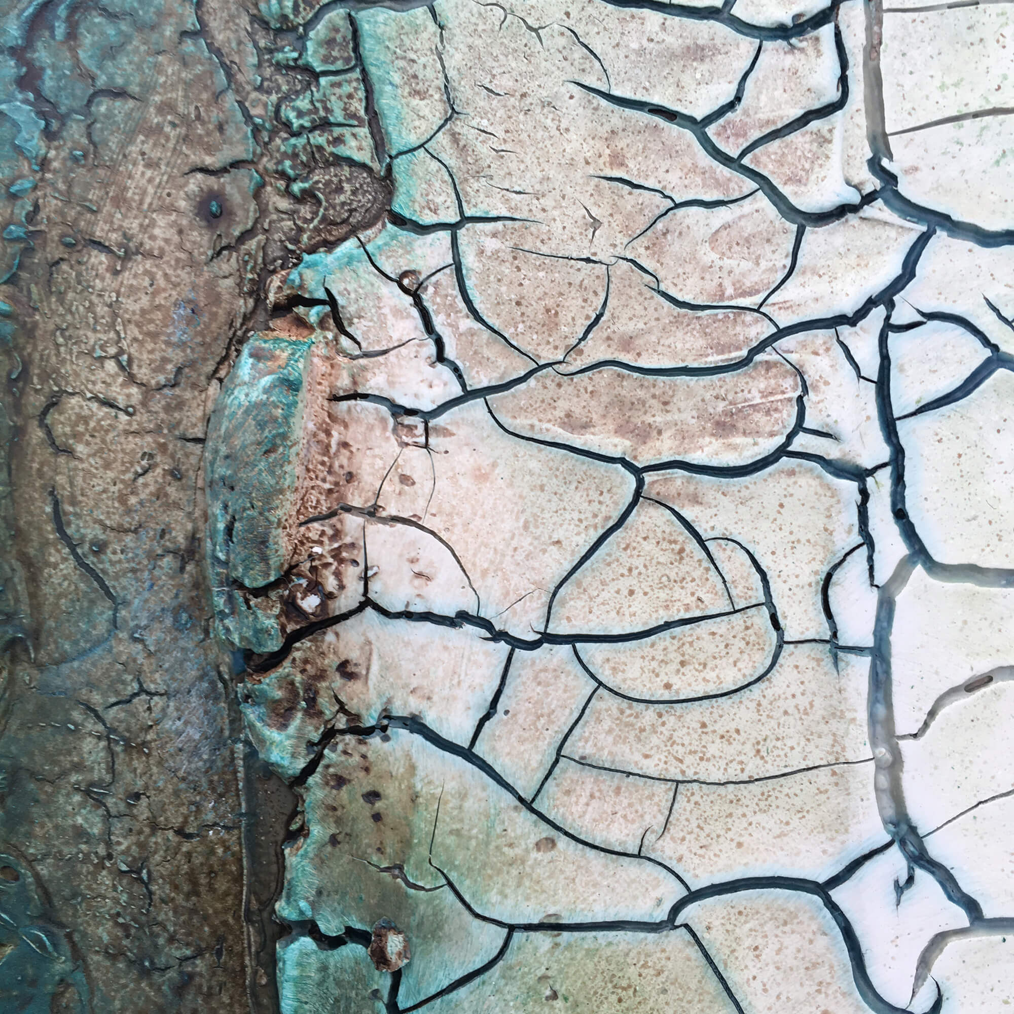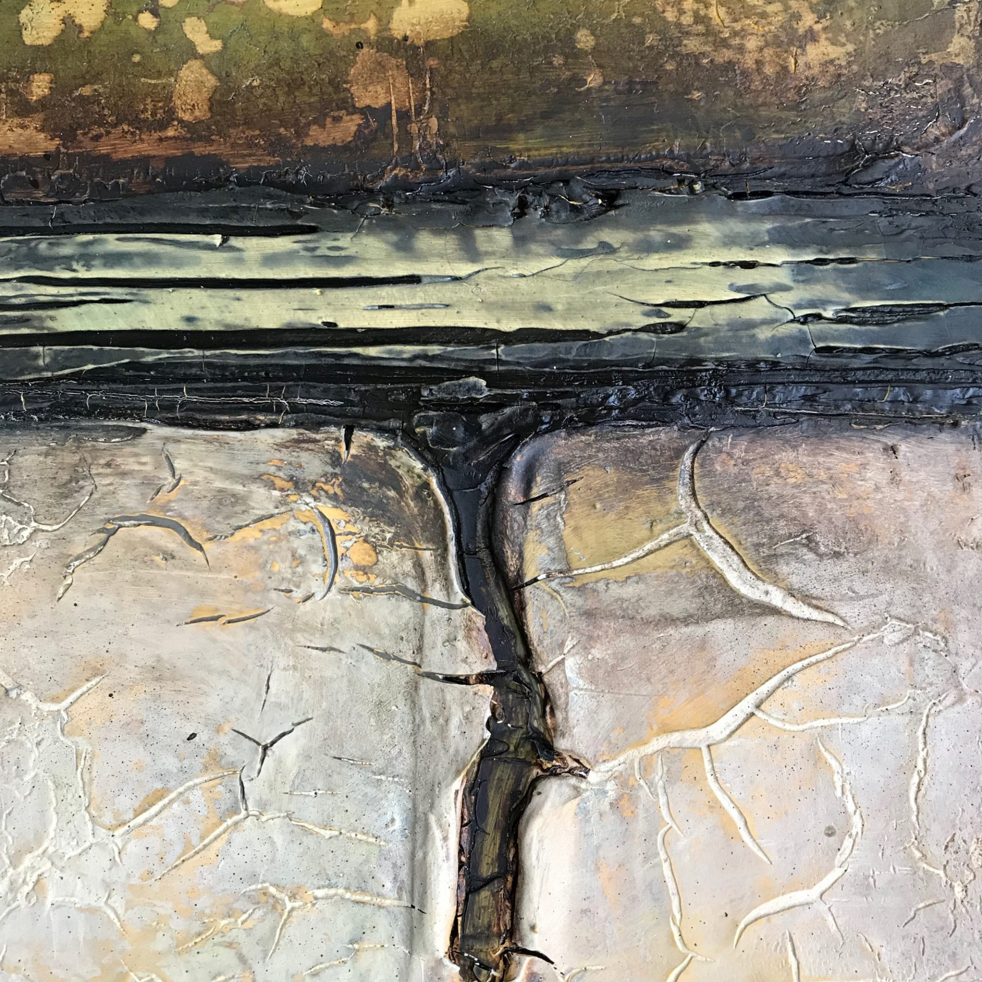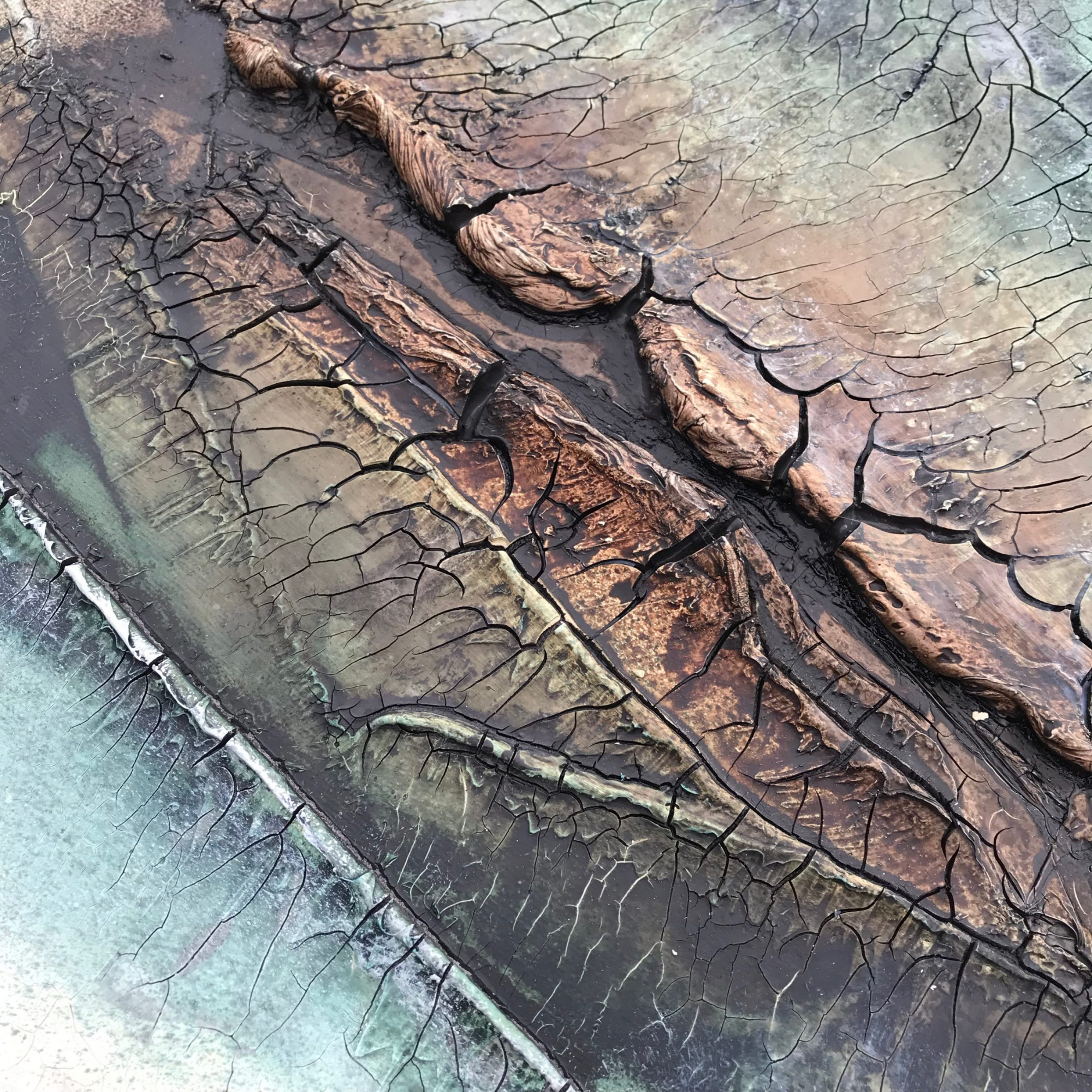 Mix Easy 3Dflex and Powertex with a scraper or palette knife to a smooth paste and apply with a palette knife on your canvas. (3-parts Easy 3Dflex – 1-part Powertex + less than 1- part water). This medium will show cracks when applied in a thick layer, by drying in the sun or close to a heat source.
