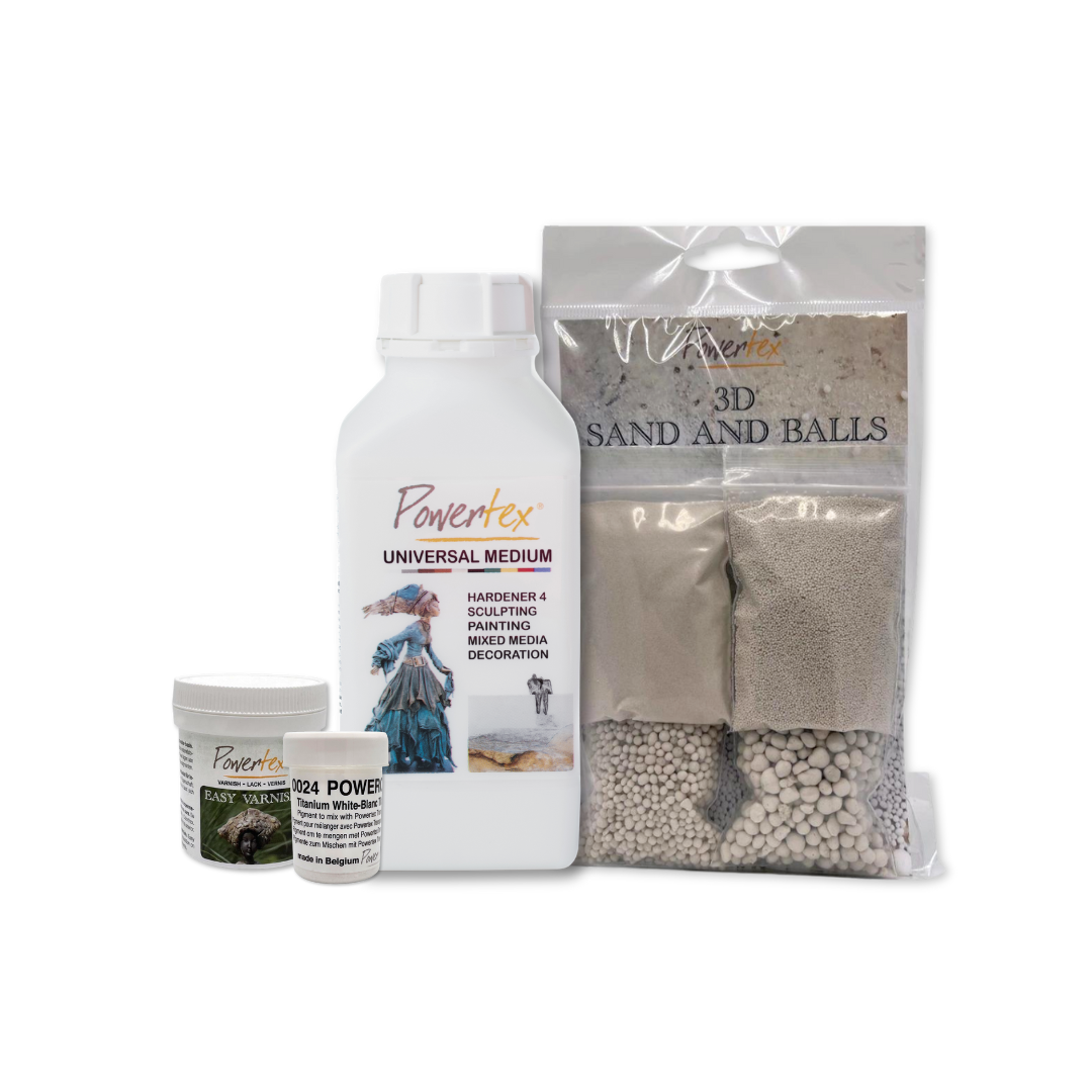 Powertex Universal Medium White 500g — the core textile-hardening medium that binds papers and elements into solid mixed-media form.